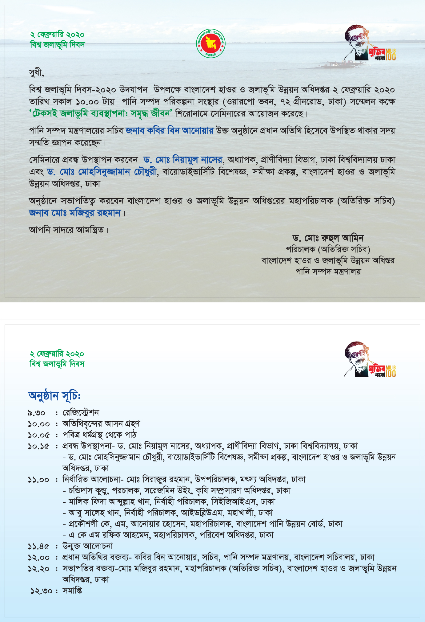 বিশ্ব জলাভূমি দিবস ২০২০ উপলক্ষে আগামি ০২ ফেব্রুয়ারি ‘টেকসই জলাভূমি ব্যবস্থাপনা: সমৃদ্ধ জীবন’ শীর্ষক সেমিনার আয়োজন করা হয়েছে (দাওয়াত পত্র সংযুক্ত)।